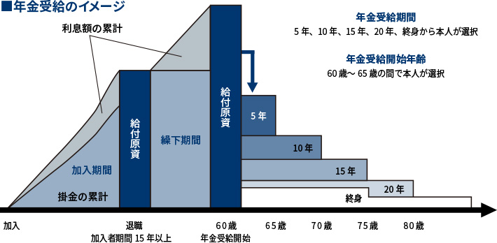 1. 加入者期間が15年以上の方・・・老齢給付金として年金または一時金で受けることができます。